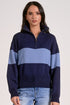 Elan Academy Colorblock Zip Up Collar Sweater in Navy and Light Blue. Quarter Zip Up Collar. Soft, Ribbed Knit Hem and Cuffs. Long Sleeves.