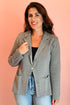 Cooper Knit Cardigan Blazer in Grey. Single Button Front Closure. Notched Collar. Pockets in Front. Fitted & Stretchy. Fits and feels like a cardigan, looks tailored like a blazer!