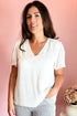 Beachside Business V-Neck Blouse in White. Flounce Flowy Short Sleeve with Pleating at Shoulder. Stripe Textured Pattern. Lined.