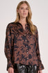 Brown Foilage Printed Flair Blouse in Chocolate Brown and a Bold Black Print. Button Front. Smocking at Cuffs with Ruffle Trim. Flowy Fit. Curved HiLo Hem.