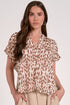 Love Lost Printed Blouse Top in Natural Brown Casablanca. Ruffle Short Sleeves with Elastic Cuff. Smocked Band in Back of waist. V-Neckline.