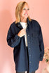 Reap What You Sow Denim Shirt Shacket in Dark Ink. Button Front Closure. Flap Front Pockets. Oversized Fit. Buttoned Cuffs on Long Sleeves. Curved Hem. Classic Dark Denim with Gold Stitching.