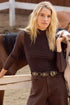 The Muse Studded Mesh Mock Neck Top in Dark Chocolate. Semi-Sheer. Mock High Neckline. Long Sleeve. Fitted. Embellished with Rhinestone Studs.
