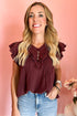 Together Forever Linen Ruffle Top in Wine. Ruffle Cap Sleeves. Buttoned Front with Ruffle Detal. Lightweight, Breathable Linen.