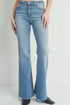 Just Black Denim Bootcut High Rise Jeans in Medium Light Wash. Raw Hem. Soft, Stretch Denim. Some Whiskering and Fading. Single Button Zip Fly Closure.