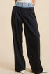 Dropout Denim Waistband Wide Leg Trouser Pants in Black. Contrast Denim Waistband with Single Button Zip Fly Closure. Wide Leg Slouchy Fit. Pockets. Sophistication meets Playful!