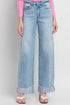 Jubilant Cuffed Baggy Wide Leg Jeans in Light Wash. Frayed Cuffed Hem. High Rise. Comfort Stretch Denim. Some Fading and Whiskering.