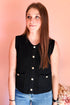 Power Mantra Sleeveless Knit Top in Black. Gold Buttons. Textured Knit Vest or Sleeveless Sweater.