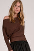 Cold Whisper Off the Shoulder Top in Dark Brown. Ribbed Knit Sweater with Asymetrical off the shoulder neckline that can also be styled as a boatneck. Banded Waist. Fitted Cuffs.