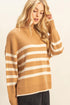DOOR BUSTER! Striped Relaxed Fit Sweater in Taupe with White Stripes and Trim at Cuffs and Hem.