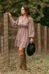Carolina Smocked Waist Dress in Mocha Brown. Stretchy Smocked Waist. Ruffle Hem. Gathered Smocking at Cuffs. Bellowy Sleeves. Split Neckline. Lined.