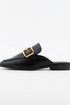 Chantal Buckled Slide Mule Flat Shoes in Black with Gold Buckle. Stacked Heel. Square Rounded Toe. -Faux PU leather mule loafer -Strap detail with adjustable buckle -Gold hardware -Almond toe