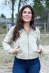 Trail Rider Corduroy Collar Barn Jacket in Khaki. Zip Up Front. Waist Length. Khaki jacket with contrasting corduroy collar in dark brown. Side Pockets.