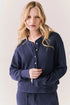 Chaser Brand Thayne Thermal Henley Top in Midnight Blue. The Thayne Long Sleeve in Midnight Blue is a cropped thermal henley top with a 3/4 button placket and subtle ribbed texture.