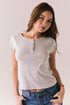 Chaser Brand Yale Harper Henley Top in Light Heather Grey. Button Detail at Neckline. Cap Short Sleeve. Style with our matching Harper Sweatpants. The Yale Henley Tee in Heather Grey gives off casual campus vibes with a polished twist. A slim fit and functional button henley neckline make this a staple that plays well with denim, sweats, or skirts.