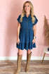 Apple Cider Dark Denim Tiered Dress in Lightweight Chambray. Short Rolled Sleeves with Button Tab at Shoulders. Button Down Front. Collar. Front Chest Pockets. Ruffled Hem. Mini Length.