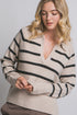 Daphne Striped Polo Sweater in Khaki and Black. Collar on Open V-Neckline. Ribbing at Cuffs and Hem.