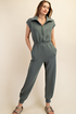 Mellow Mood Jogger Jumpsuit. Modal Scuba Jumpsuit with Half Zip with Pop Up Collar. Cap Short Sleeves. Stretchy, Smocked Waistband. Side Pockets. Elastic Hem. Super Soft & Lightweight! Perfect for Travel!