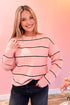 Redefined Striped Pullover Sweater in Pink with Black and White Stripe Pattern. Relaxed Fit. Long Sleeves. Crew Neckline. Ribbing at Hem, Cuffs and Neckline.