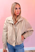 Parkwood Bubble Hem Jacket in Khaki. Covered Zip Up Jacket. Pop Up Collar. Buttoned Cuffs. Elastic Bubble Gathered Hem. Side Pockets.