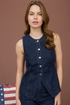 Desk to Dawn Denim Tailored Vest in a dark wash. Button Front. Round Neckline. Angled Split Hem. Sleeveless. Fitted.