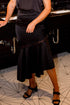 Asymmetrical Satin Midi Skirt in Black. Lace Insert Detail. Side Zip Closure. Flared Asymmetrical Hem.