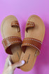 Free Peole Amelie Tiny Stud Toe Ring Sandal in Cognac Leather. Cushioned Bed. Slip On Sandal with Toe Ring detail to give this sandal Free People Boho Vibes! Tiny Chrome Studs.