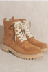 Amora Military Lace Up Boot in Camel. Side Zip. Rugged Sole. Faux Suede Upper. Pull Up Tab in Back.