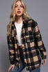 Fading Hour Plaid Fleece Shacket in Black and Taupe. Button Front. Flap Chest Pockets. Curved Hem. Button Down Front.