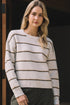 Hot Cider Camel & Olive Stripe Sweater in Ivory. Pullover Sweater with Crew Neckline. Ribbing Hem and Cuffs on Long Sleeves.