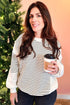 Sheronal Contrast Panel Striped Sweatshirt in Ivory and Black. Solid Panel at Sides and Sleeves. Banded Waist. Relaxed and Roomy Fit.