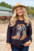 These Boots Jacquard Knit Sweater in Navy. Western Boots Jacquard Printed Sweater with Solid Back. Relaxed Fit. Pullover. Long Sleeves with Drop Shoulder.