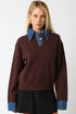 Triana Denim Knit Top in Dark Brown. Pullover Knit Sweater with Contrast Denim Collar and Cuffs. Relaxed Fit.