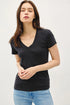 Classic V-Neck Slim T-Shirt in Faded Black. Deep V-Neckline. Slim Fit. Hip Length. Short Sleeve. Staple Basic for layering or separates.