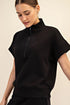 Midnight Walks Quarter Zip Scuba Top in Black. Quarter Zip Neckline with Collar. Short Sleeves with Drop Shoulders. Soft, Scuba Spandex Material. Relaxed Fit.