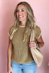 Serenade Contrast Trim Knit Top in Tan with Cream Trim. Button Back (or Front) Detail. Soft Knit Short Sleeve Sweater in Tan with Cream Trim. Round Neckline