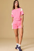 Goal Keeper Retro French Terry Short Set in Pink. Elastic Waistband on Shorts with Pockets. Cropped Length Pullover Top with Dropped Shoulders on Short Sleeves. Crew Neckline.