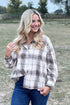 Fall Schedule Plaid Boxy Shacket Shirt in Khaki. Boxy Fit. Button Down Front. Collar. Drop Shoulder. Long Sleeves. Style Buttoned or undone.