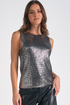 Starlight Silver Sequin Knit Top. Sleeveless Knit Top with Silver Metallic Shine! High Neckline. Style under a Blazer or with a Leather Skirt for a Cocktail Event!