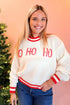 HO HO HO Christmas Graphic Sweater in Cream with Red Stripe Detail at Neckline, Cuffs and Hem. Long Sleeve. Crew Neck.