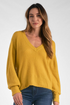 Honey I’m Good Sweater in Gold. V-Neckline. Soft Fuzzy Knitted Sweater with Rolled Ribbed Cuffs. Ribbing at Hemline.
