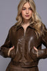 Marston Faux Leather Bomber Jacket in Hazlenut Brown. Zip Front Closure. Side Pockets. Washed Leather Effect. Collar. Banded Sleeves and Hem.