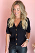 Sadie Collared Toggle Button Top in Black. Short Sleeve Knit Lightweight Sweater with V-Neckline and Collar. Short Puff Sleeve. Gold Toggle Button Front Closure.